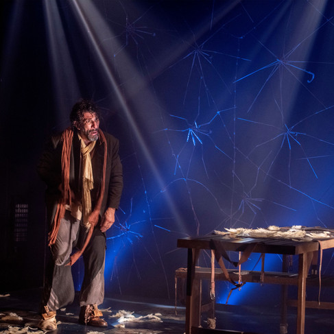 Ao entrarmos na sala de espetáculo, o cenário criado por Nello Marrese nos recebe de cortinas abertas. No fundo do palco, uma estrutura de arame nos faz pensar naquelas aranhas pernudas. Pensei também em sinapses cerebrais, bem adequadas a uma peça sobre loucura (mas não só: é ainda sobre amor não correspondido, abismo entre as classes sociais, estrutura estatal opressora, entre outras coisas). Então o espetáculo começa, o palco é iluminado e Milhem Cortaz entra em cena com um guarda-chuva sem tecido, apenas o cabo e as varetas. É quando percebo: a estrutura no fundo do palco é feita de vários "esqueletos" de guarda-chuvas quebrados.